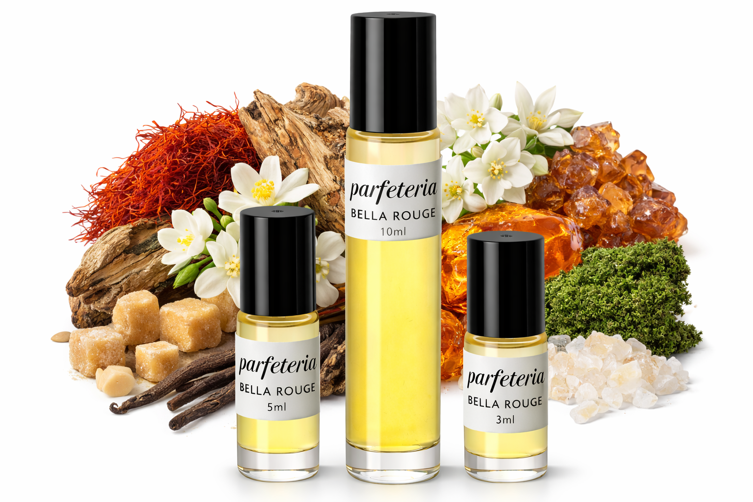 Bella Rouge ist ein ausdrucksstarker Duft mit einer eleganten Balance aus floraler Leichtigkeit und warmer Tiefe. Die Kopfnote eröffnet mit feinem Safran und zartem Jasmin und verleiht dem Duft eine edle, leicht süßliche Frische.